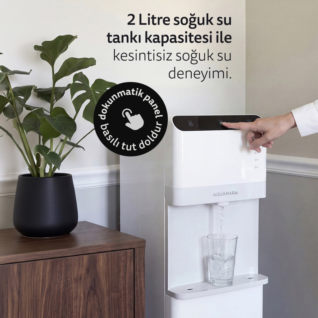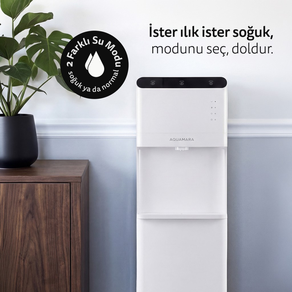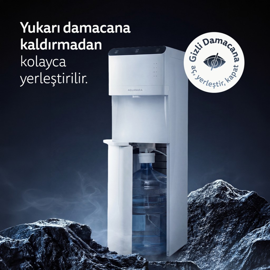 Alttan gizlenmiş damacana sistemi, hem estetik bir görünüm sağlar hem de damacana değişimini kolaylaştırır. Sessiz çalışma özelliği sayesinde ev, ofis, klinik ve toplantı alanlarında rahatsızlık yaratmadan kullanılabilir.