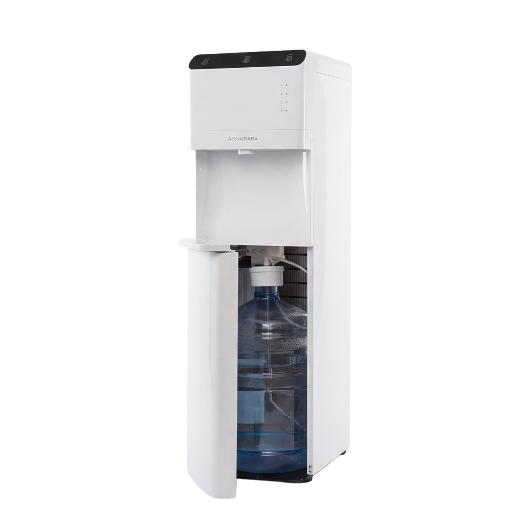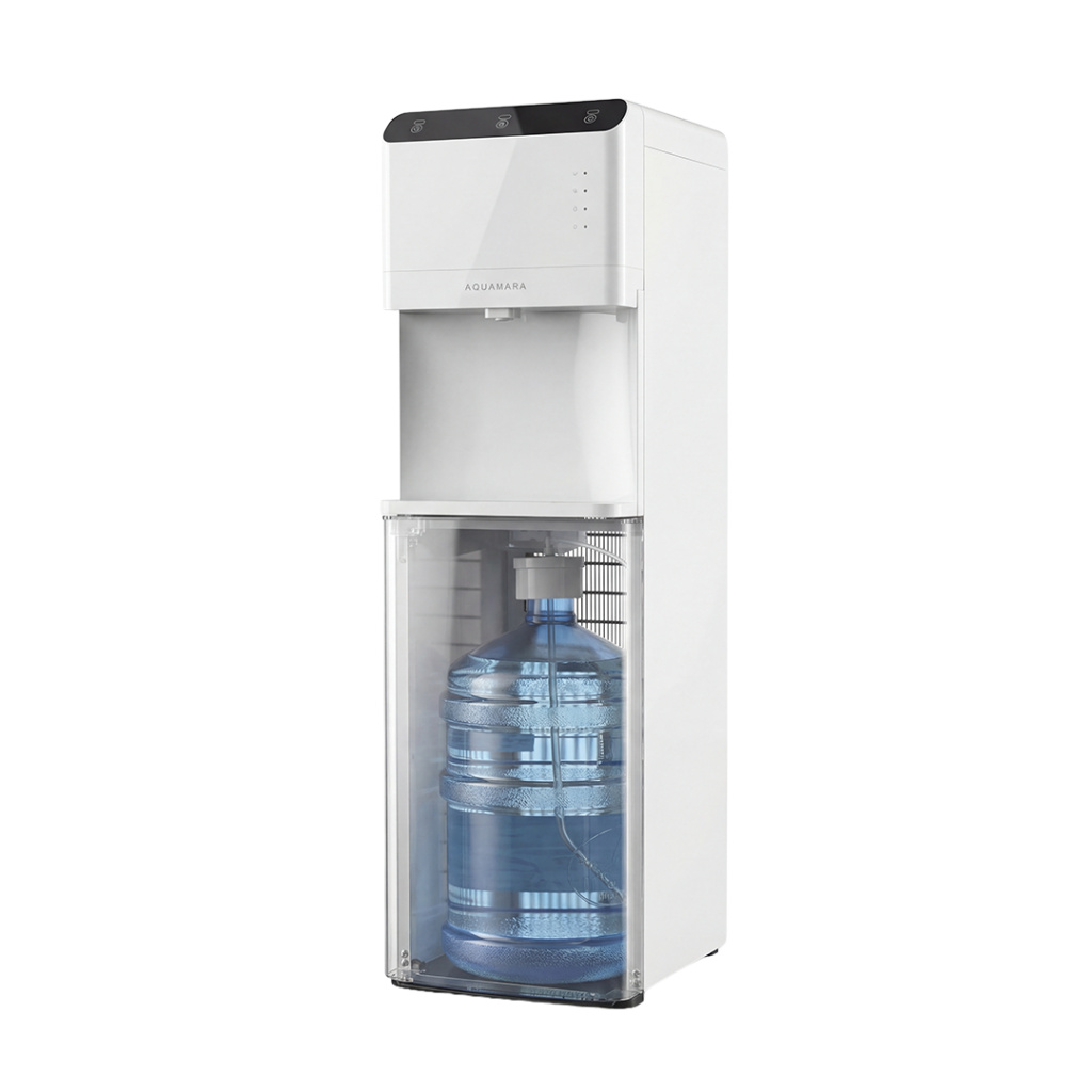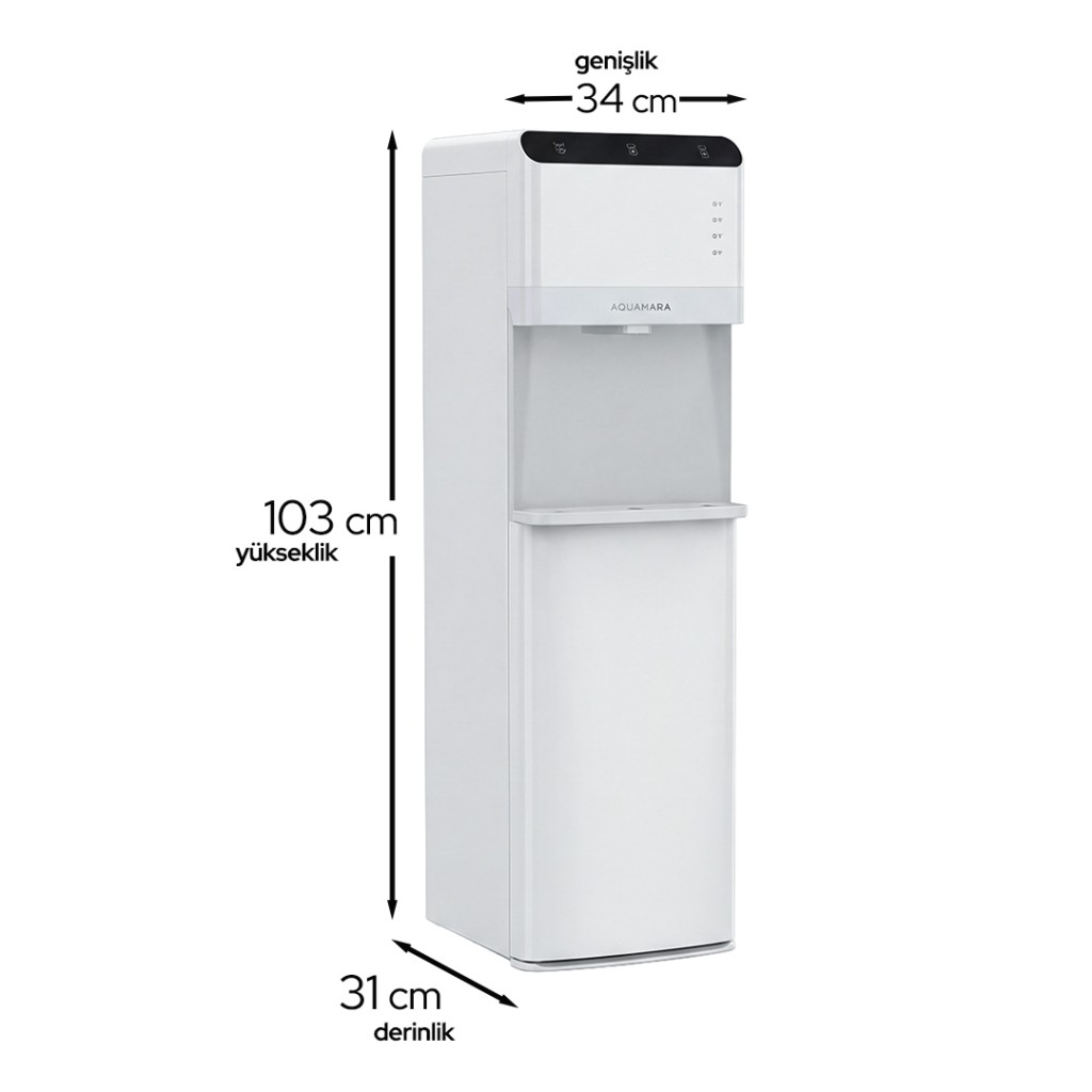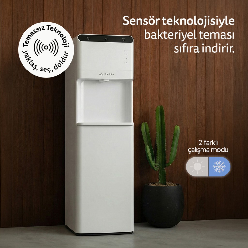Alttan gizlenmiş damacana sistemi, hem estetik bir görünüm sağlar hem de damacana değişimini kolaylaştırır. Sessiz çalışma özelliği sayesinde ev, ofis, klinik ve toplantı alanlarında rahatsızlık yaratmadan kullanılabilir.