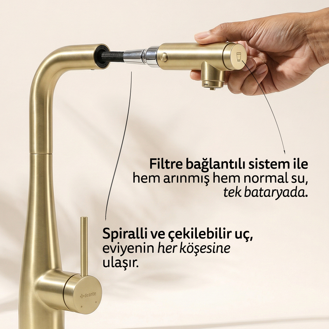 Deante ERIDAN spiralli mutfak bataryası, mutfakta içme suyu ihtiyacını ayrı bir musluk kullanmadan karşılamak isteyen kullanıcılar için tasarlanmıştır. Spiralli çekilebilir hortum yapısı, hem geniş hareket alanı sağlar hem de profesyonel mutfak tipi bir kullanım deneyimi sunar.
