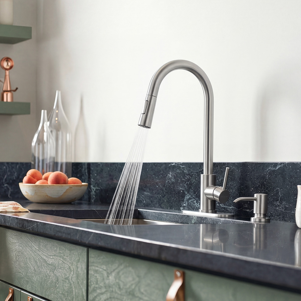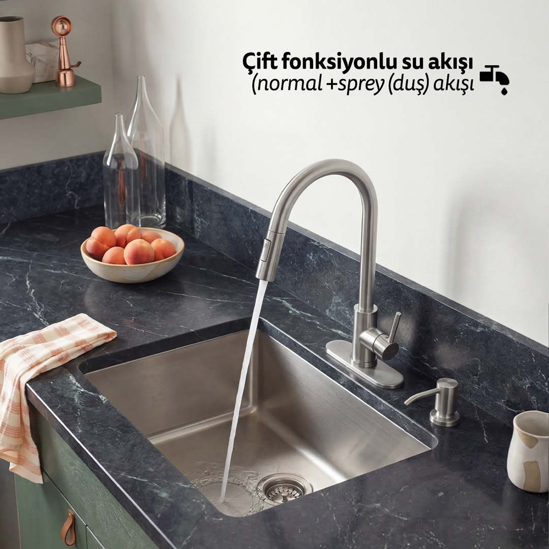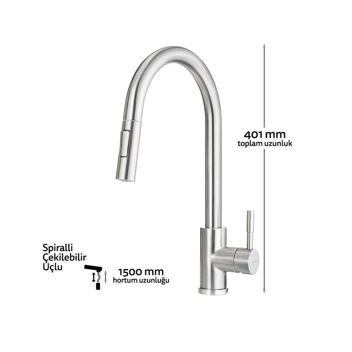 401 mm yüksek gövde tasarımı, büyük tencere ve sürahileri rahatça doldurmanıza imkân tanır. Çift fonksiyonlu su akışı (normal ve duş modu), hem günlük kullanım hem de güçlü durulama işlemleri için idealdir.