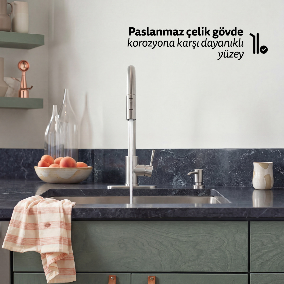 AISI 304 paslanmaz çelik gövdesi, korozyona karşı yüksek dayanım gösterir ve uzun yıllar formunu korur. Deante Lima, hem estetik hem dayanıklılık arayan kullanıcılar için güvenilir bir mutfak bataryası çözümüdür.