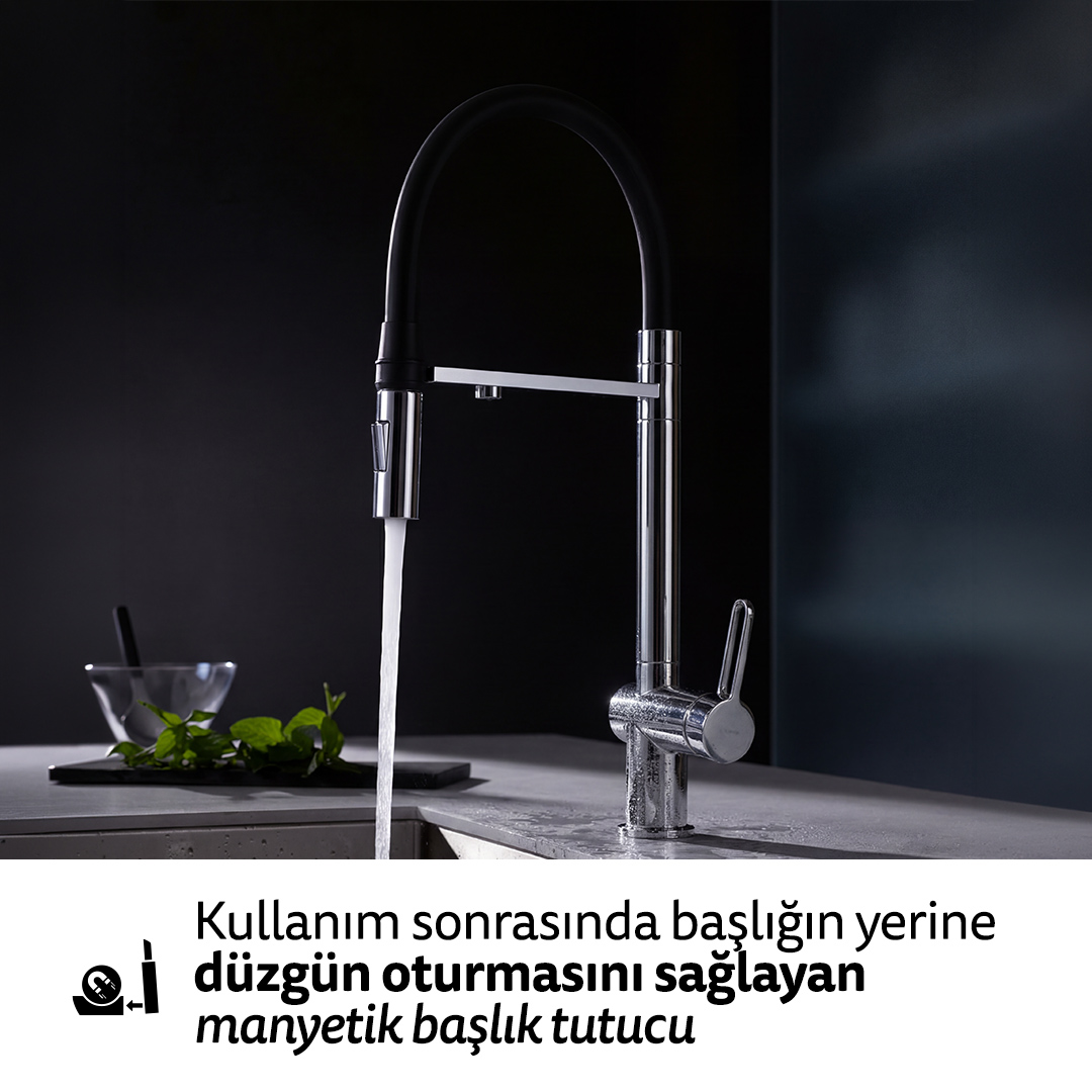 Deante MAGNETIC mutfak bataryası, mutfakta düzen ve kontrol arayan kullanıcılar için tasarlanmıştır. Ürünün en belirgin farkı, manyetik başlık tutucu sistemidir. Çekilebilir ve esnek uç, kullanım sonrası yerine düzgün şekilde oturur; dağınık görüntü ve sarkma problemi ortadan kalkar.