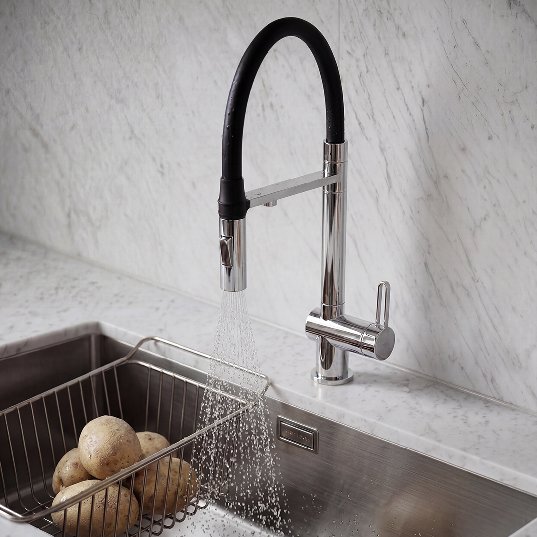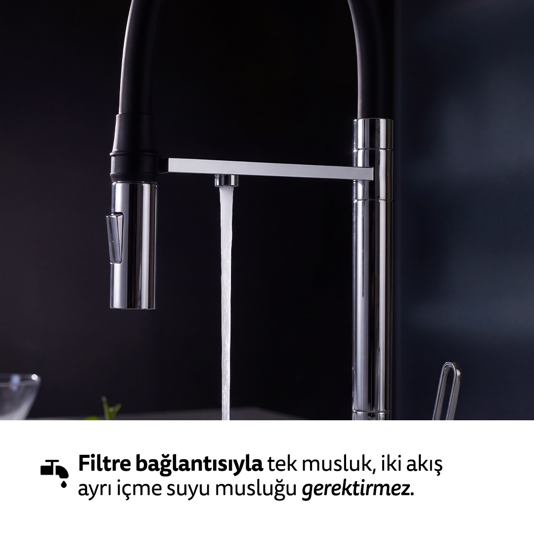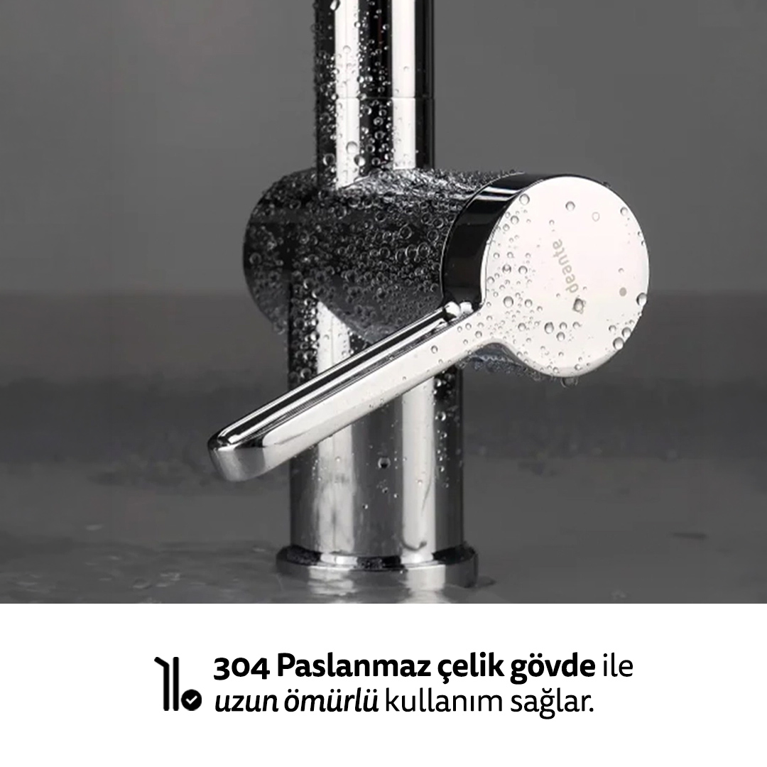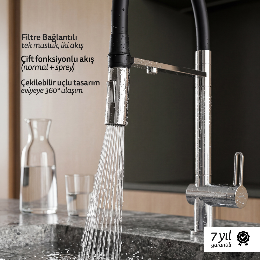 Esnek uç yapısı, tencere doldurma, evye temizliği ve sebze–meyve yıkama gibi günlük mutfak işlerinde hareket alanını genişletir. Çift fonksiyonlu su çıkışı, normal akış ve sprey modu arasında kolay geçiş sağlayarak hem hassas hem de güçlü durulama imkânı sunar.