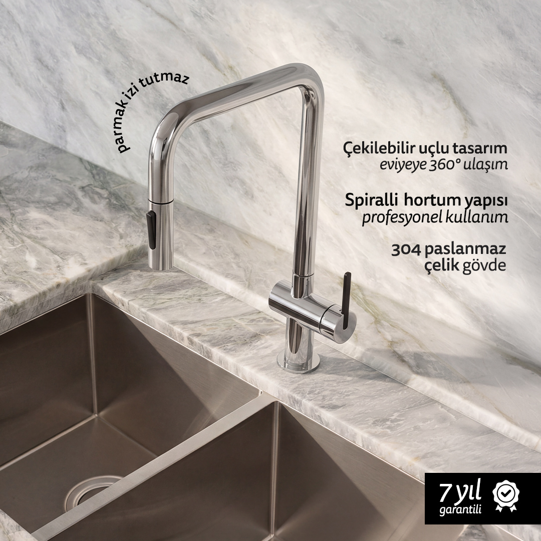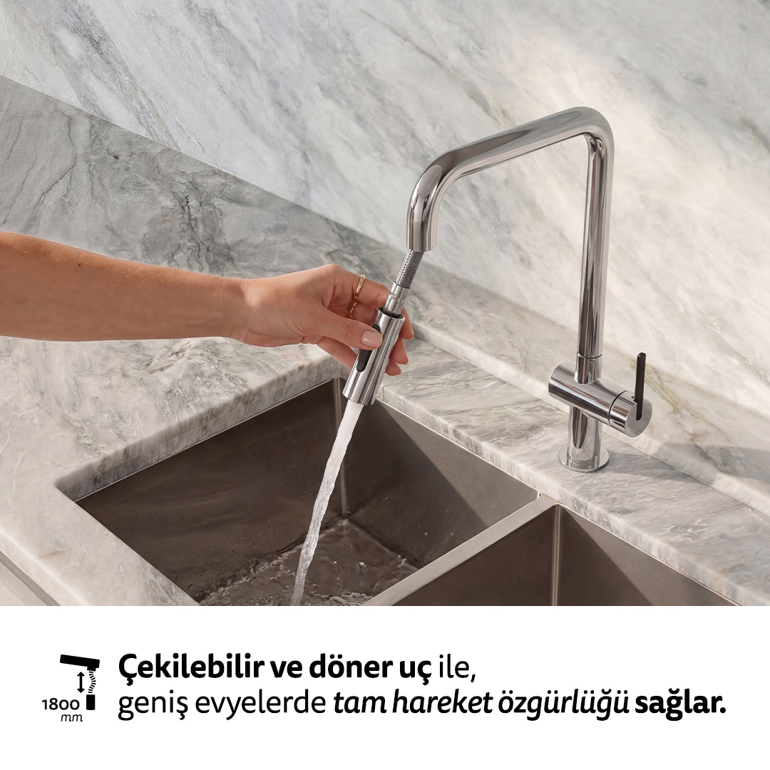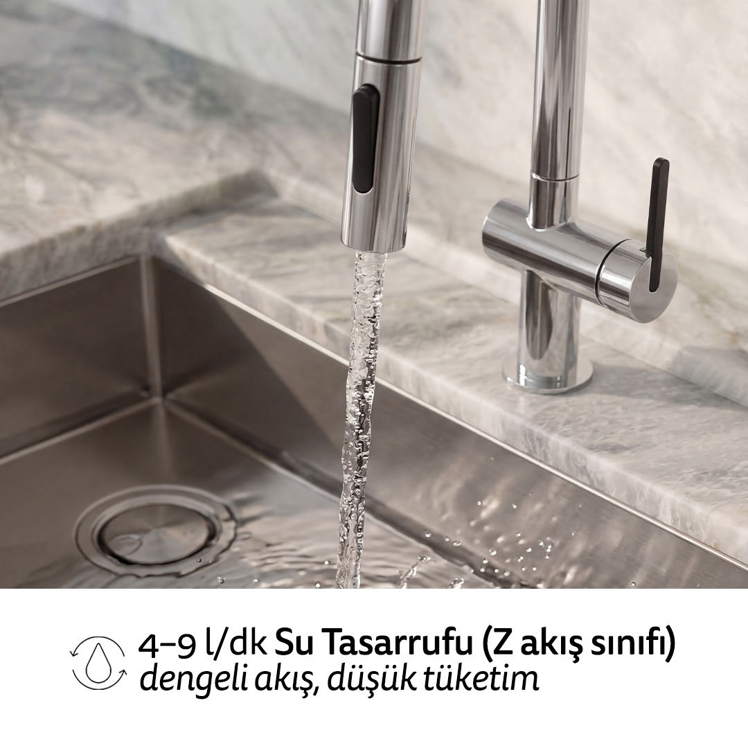 Çekilebilir ve döner uç tasarımı sayesinde evye temizliği, büyük tencerelerin ve fırın tepsilerinin yıkanması zahmetsizleşir. Spiralli yapı, hortumun formunu korumasına yardımcı olurken profesyonel mutfak hissi sunar ve uzun süreli kullanımda kontrol avantajı sağlar.