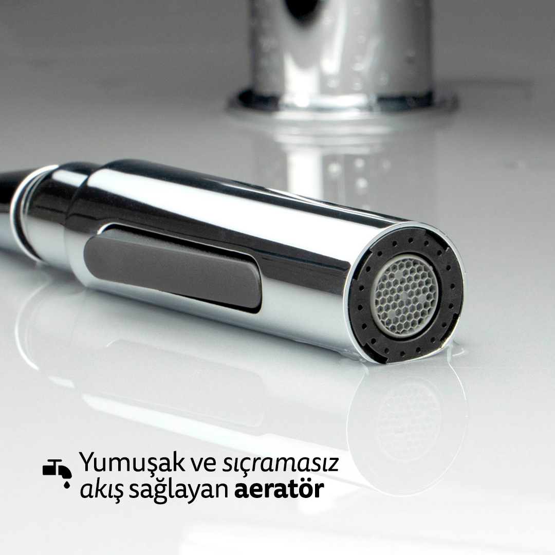 Bataryada kullanılan honeycomb aeratör, suyu hava ile karıştırarak daha yumuşak, dengeli ve sıçramasız bir akış oluşturur. Z akış sınıfı (4–9 l/dk), su tüketimini azaltırken performanstan ödün verilmemesini sağlar. Aynı zamanda sessiz çalışma özelliği, özellikle açık mutfaklarda ve uzun süreli kullanımlarda konforu artırır.