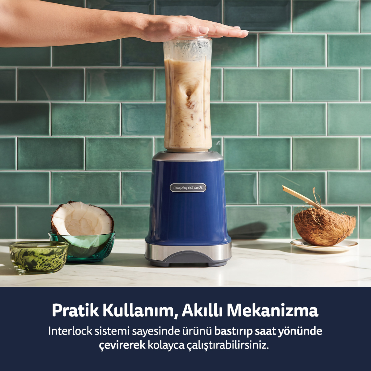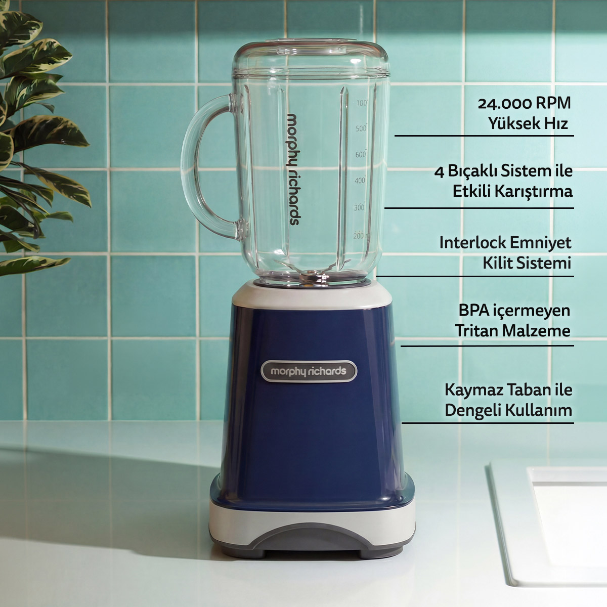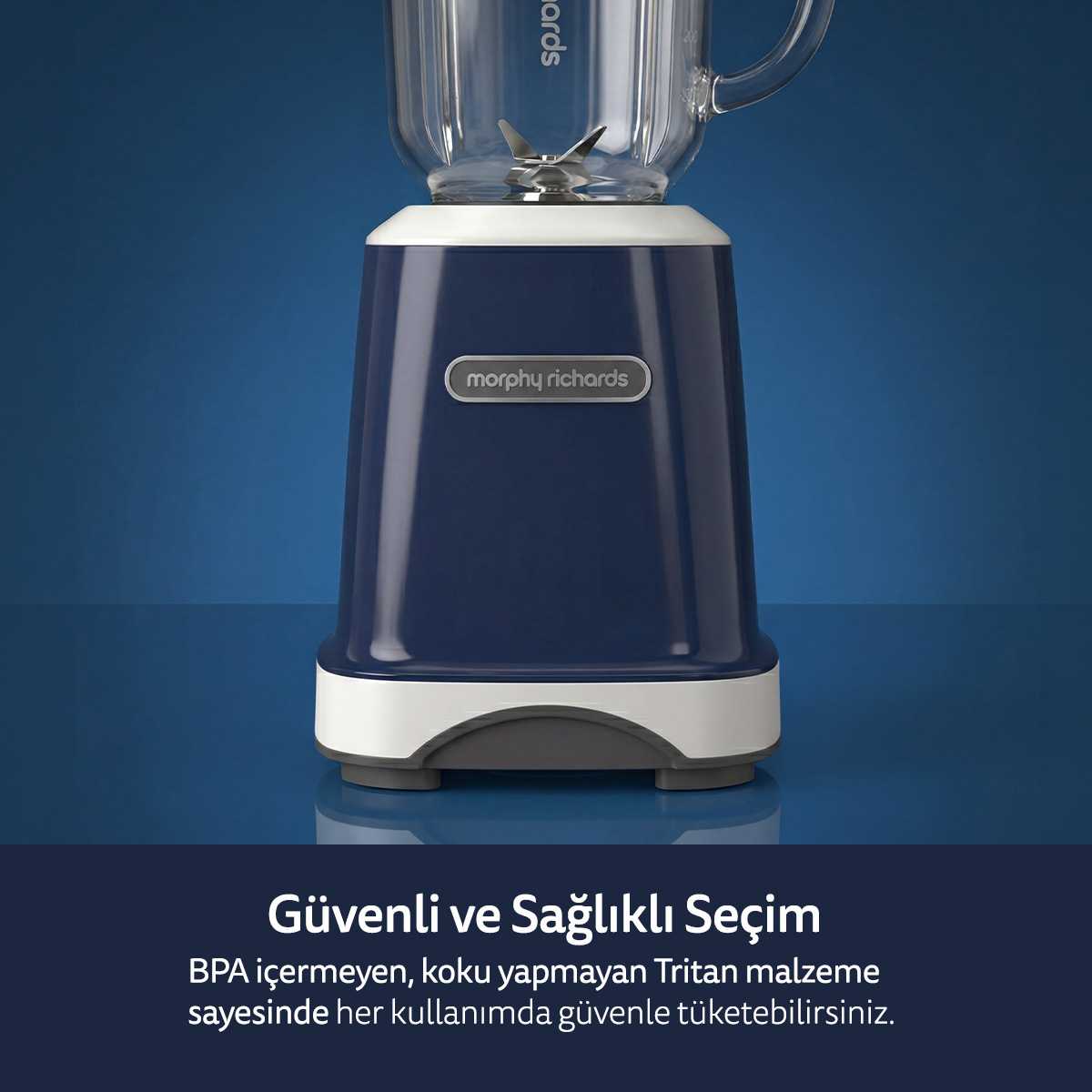 BPA içermeyen Tritan malzeme, güvenli ve sağlıklı kullanım sunarken; tek dokunuşla çalışma ve interlock güvenlik sistemi ile günlük kullanımda maksimum konfor sağlar. Kompakt yapısı sayesinde mutfakta minimum alan kaplar, şık Mediterranean Blue rengiyle modern bir görünüm kazandırır.