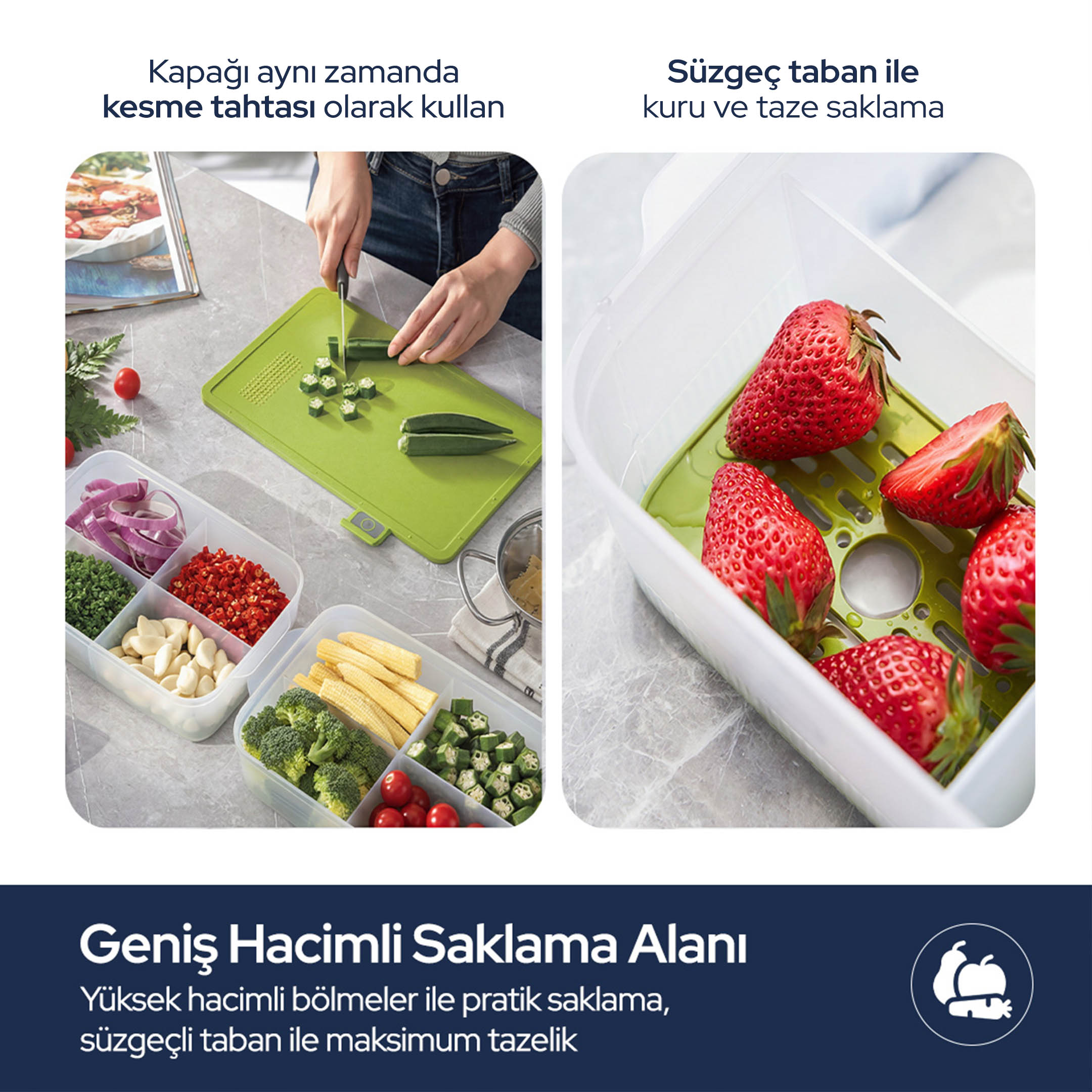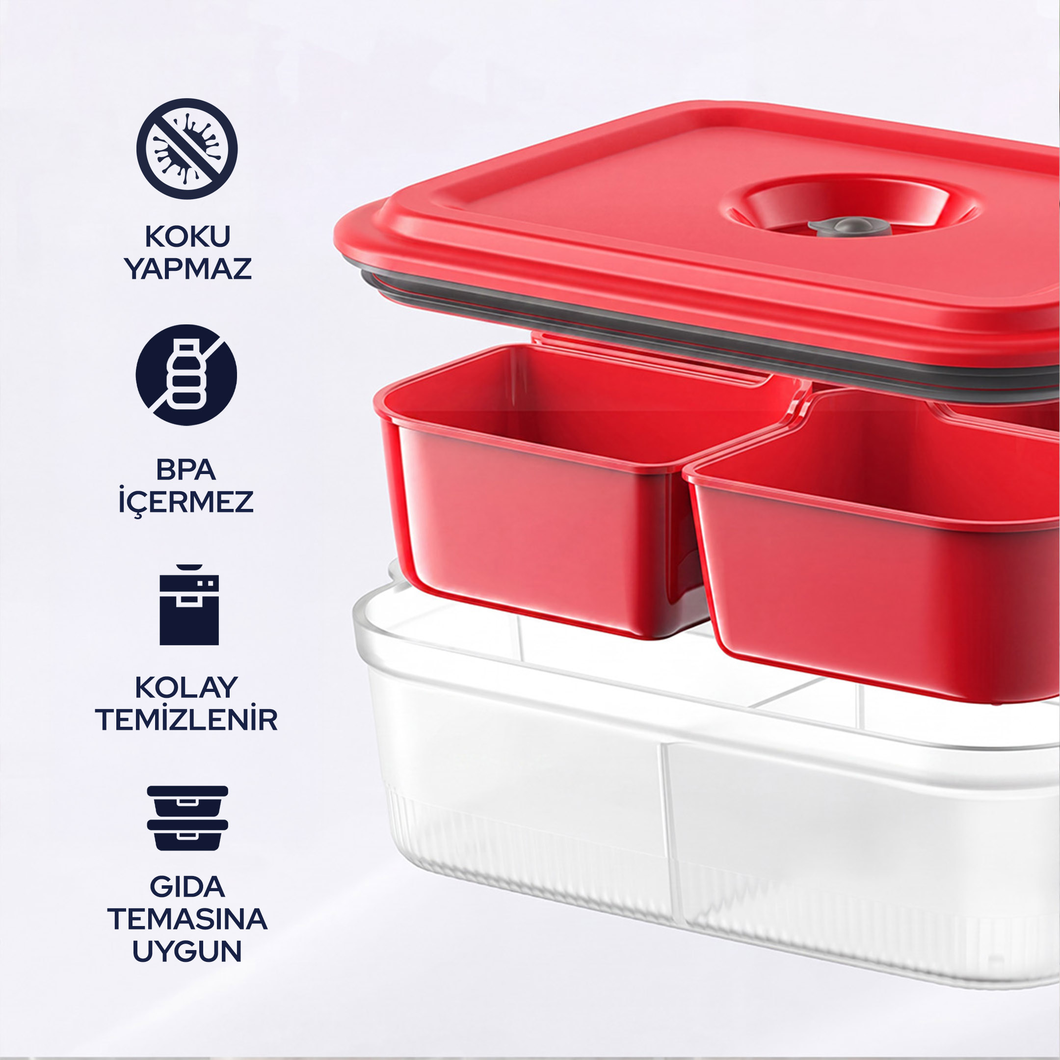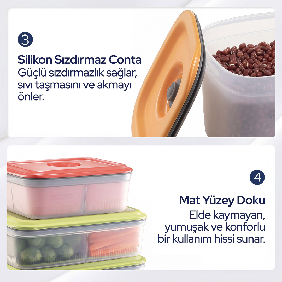 Sızdırmaz kapak yapısı, sıvı dökülmelerini önlerken; modüler ve bölmeli tasarım farklı gıdaları ayrı ayrı saklamanıza olanak tanır. Bu sayede hijyen korunur ve karışma riski ortadan kalkar.