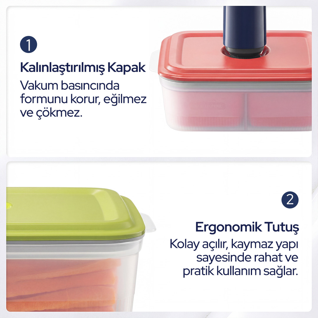 Gelişmiş vakum teknolojisi sayesinde kap içindeki hava çekilerek oksidasyon yavaşlatılır. Böylece gıdalar daha uzun süre taze kalır, lezzet ve besin değeri korunur.