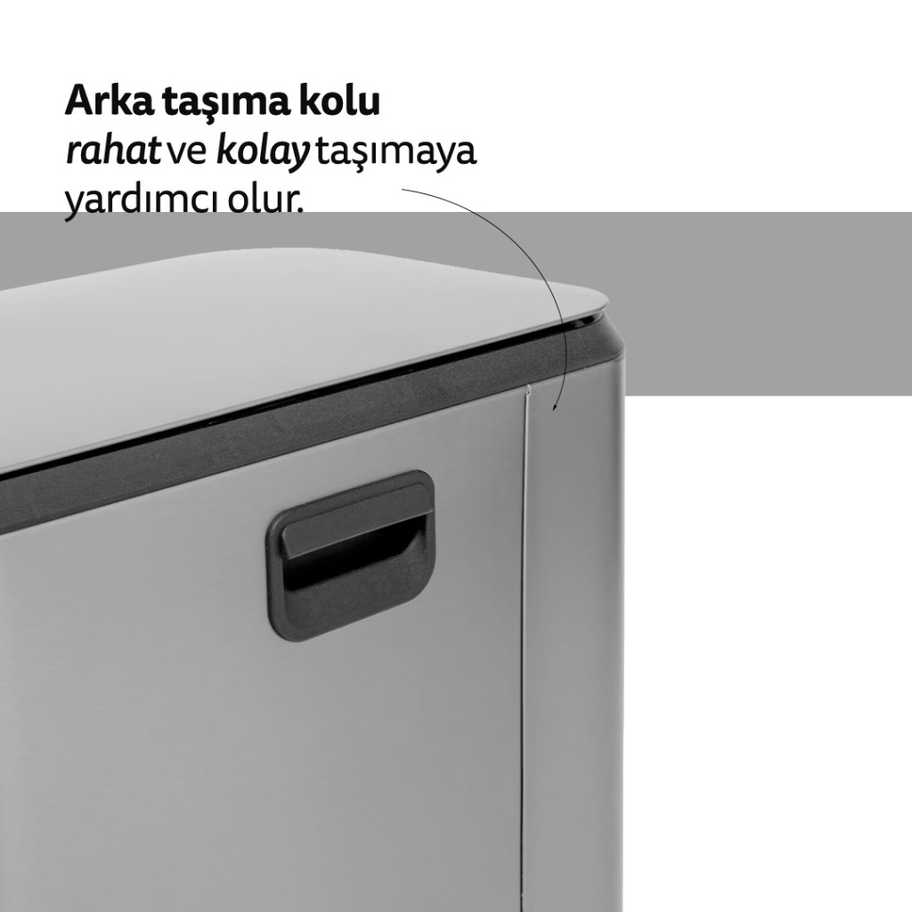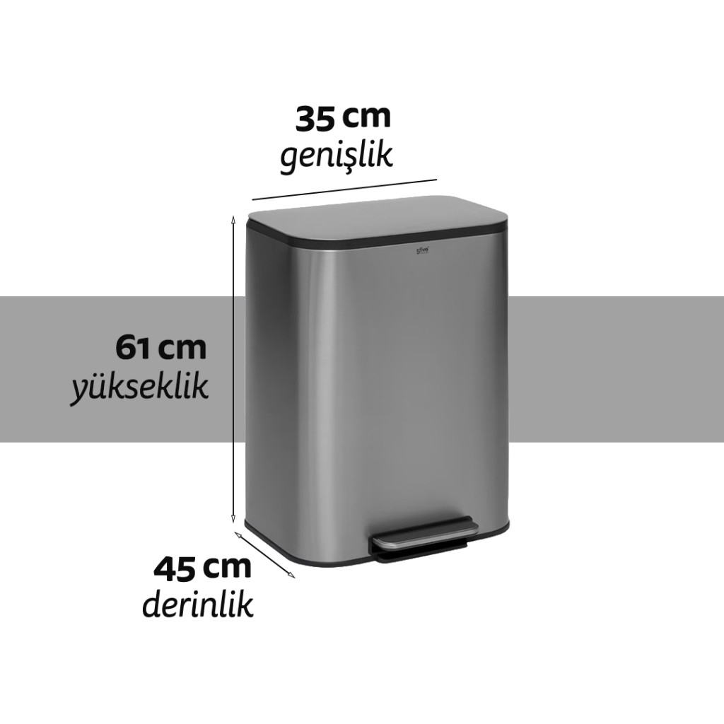 TITAN 50 LT metal pedallı çöp kutusu, şık paslanmaz çelik gövdesi ve ergonomik tasarımıyla mutfak, banyo ve ofis gibi alanlarda hem fonksiyonel hem estetik bir çözüm sunar. Pedallı çöp kovası mekanizması sayesinde kapağa temas etmeden hijyenik kullanım sağlar. Yavaş kapanma (soft close) özelliği ise kapağın sessiz ve kontrollü kapanmasına yardımcı olur. Kompakt yapısı ile dar alanlara kolayca uyum sağlar.